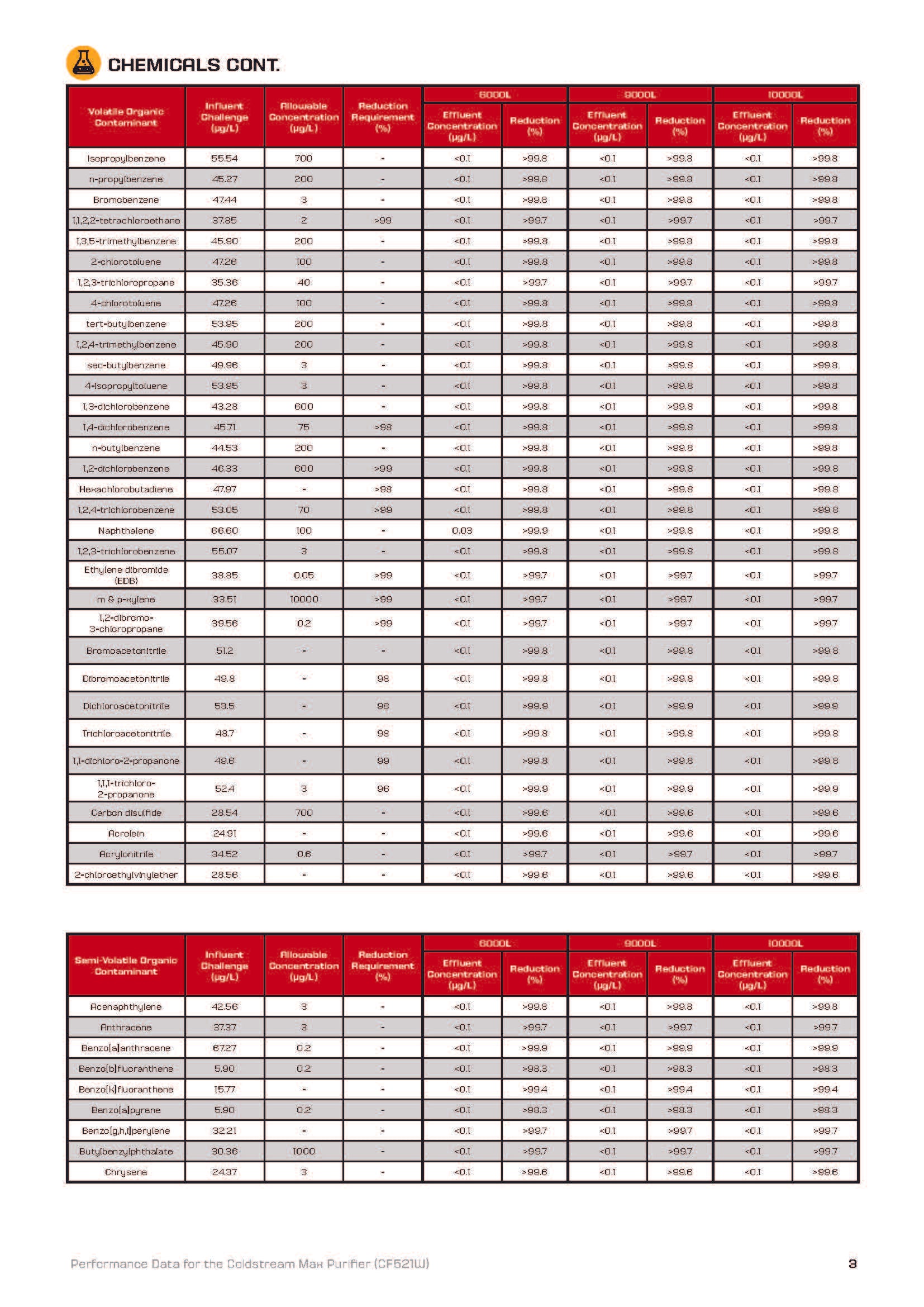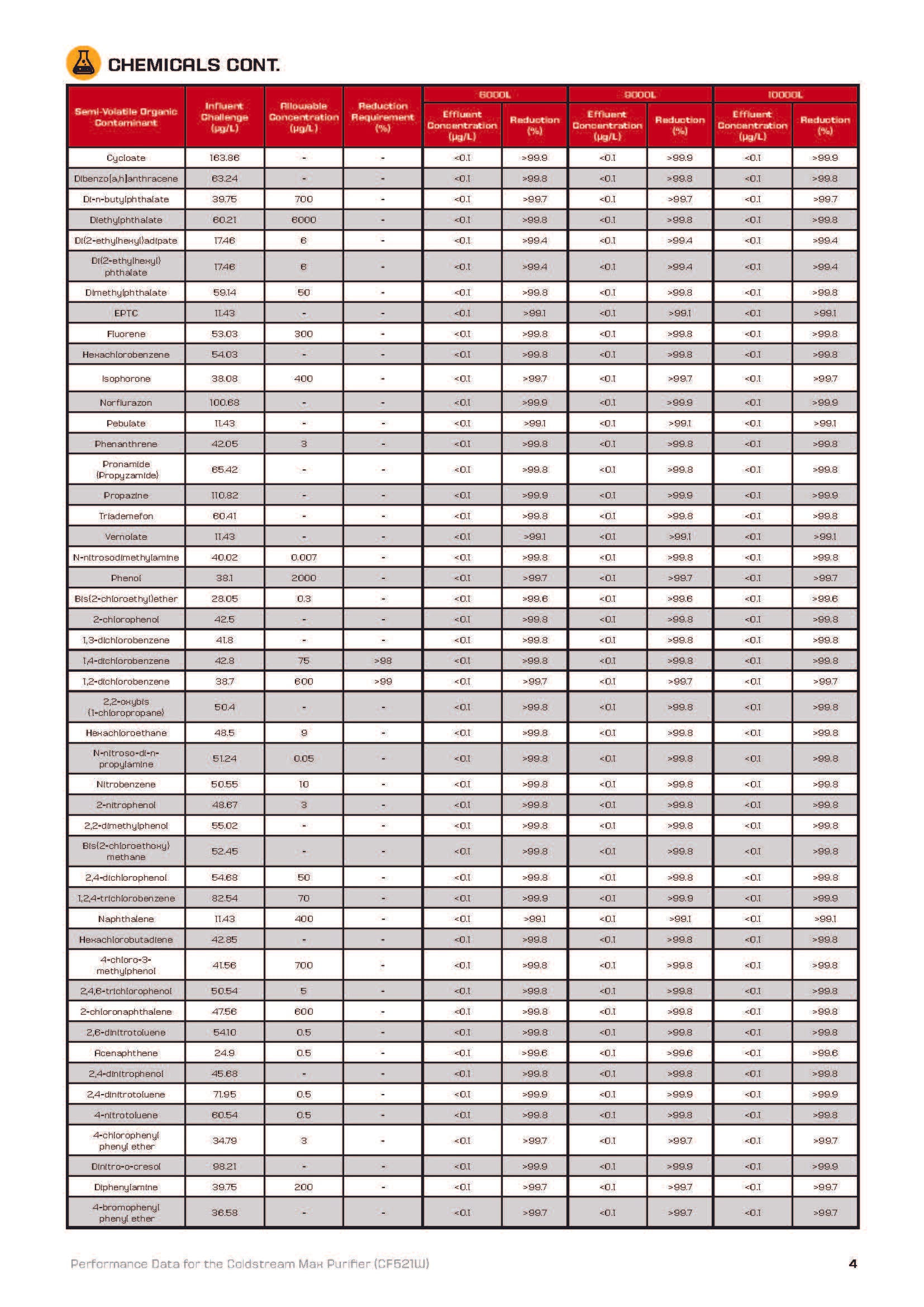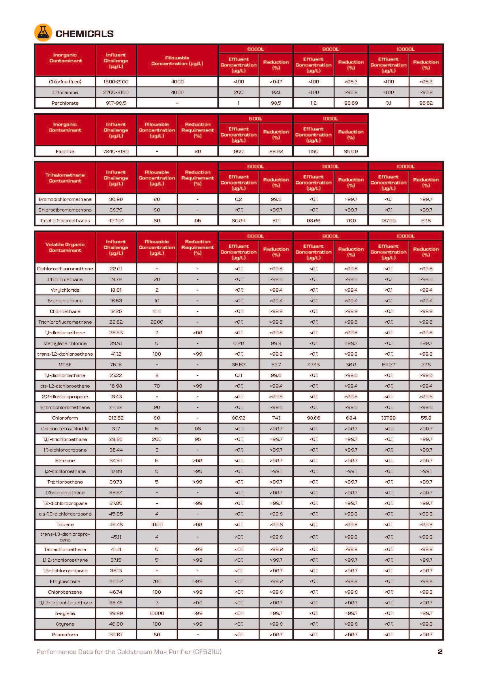 - 99,9 % des métaux lourds (plomb, mercure...), nitrates, fluor, chlore, chloramine